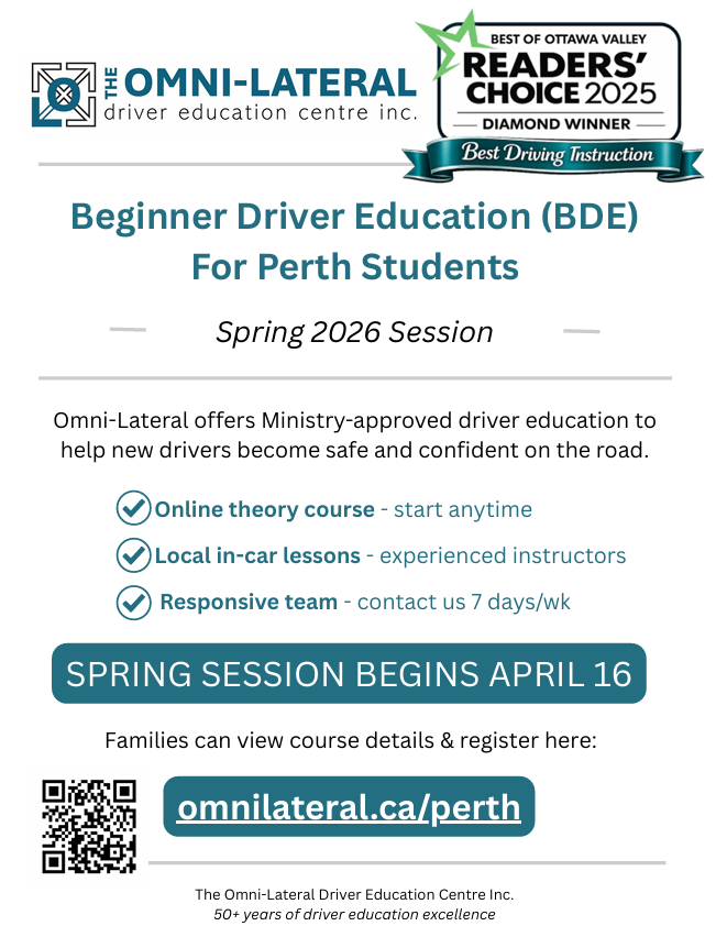 Information for the Omni-Lateral Driver Education Course is available in the office. Interested students are asked to sign up on the sheet in the office or by scanning the QR code. Theory classes are completed online and begin April 16. Students must be 16 by mid June.